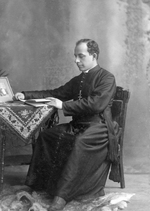 Description :L'ABBE CHARLES J.ROY ASSIS ET FEUILLETANT UN LIVRE ET DEBOUT PRES D'UNE TABLE.