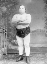Description :LOUIS CYR, SAMSOM CANADIEN. DEBOUT DANS UN STUDIO DEVANT UNE TOILE QUI RECOUVRE LE MUR ET QUI REPRESENTE UN PAYSAGE QUELCONQUE.