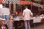 Description :VISITEUR DEVANT UNE TABLE COUVERTE D'ANTIQUITES. UNE GUIRLANDE EST POSEE AU-DESSUS DE LA TABLE. UN VENDEUR EST ASSIS DERRIERE LA TABLE. MAISON AVEC GRANDE GALERIE, DERRIERE LA TABLE.