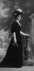 Description :FEMME NON IDENTIFIEE DANS LA TRENTAINE. ELLE EST TRES ELEGANTE DANS SA ROBE DE VELOURS NOIR ET SON CHAPEAU DE FOURRURE. ELLE TIENT DES GANTS DANS SA MAIN DROITE, ELLE POSE L'AUTRE MAIN SUR UNE COLONNETTE.