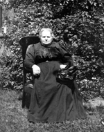 Description :PORTRAIT D'UNE FEMME AGEE NON-IDENTIFIEE ASSISE DEHORS DANS UN FAUTEUIL. REVETUE D'UNE ROBE LONGUE NOIRE, ELLE TIENT SON CHAPEAU A LA MAIN.