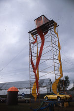 Description :84.1 : TOUR ERIGEE PAR LE FESTIVAL AVEC ENSEIGNE AU SOMMET PORTANT L'EMBLEME DU FESTIVAL AVEC DES RUBANS JAUNES ET ORANGES DESCENDANT VERS LE BAS. SITUEE AU COIN DES RUES PARC ET TERRILL. - 84.2 : LA MEME TOUR, LE SOIR. L'EMBLEME EST LUMINEUX....