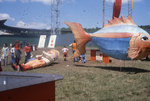 Description :89.1 : AUX ABORDS DU STADE AMEDEE-ROY, PLUSIEURS PERSONNES S'AFFAIRENT A L'INSTALLATION DES MONUMENTS DONT UN ENORME POISSON ET UN PERSONNAGE ETENDU PAR TERRE. - 89.2 : UNE GRENOUILLE SOURIANTE, TOUTE HEUREUSE D'ETRE INSTALLEE AU PARC VICTORIA...