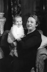Description :UNE FEMME DANS LA QUARANTAINE AVANCEE TIENT UN JEUNE BEBE AGE D'ENVIRON 8 MOIS DANS SES BRAS.