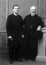 Description :L'ABBE EMILE CHARTIER ET LE CURE VAILLANCOURT DE ST-GEORGES SONT PHOTOGRAPHIES DEBOUT, A L'INTERIEUR.