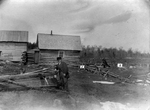 Description :ON VOIT UNE MAISON EN BOIS ROND, UN HOMME ET SA TERRE EN DEFRICHE