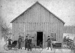 Description :CINQ HOMMES DONT QUATRE PORTANT UN TABLIER POSENT AVEC TROIS SLEIGHS DEVANT UN BATIMENT RESSEMBLANT A UNE GRANGE. LE PREMIER SUR LA GAUCHE EST FREDERIC-ANTOINE BIRON.