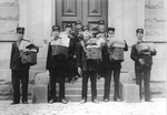 Description :GROUPE DE 8 FACTEURS AVEC LEUR SACOCHE BOURREE DE COURRIER. CEUX-CI SONT EN UNIFORME ET SE TIENNENT DEBOUT A L'EXTERIEUR D'UN EDIFICE.