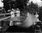 Description :QUATRE ARTISANES QUI TRAVAILLENT LA COURTE POINTE EN PLEIN AIR.