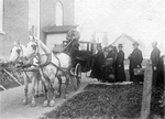 Description :CINQ RELIGIEUX, MGR LAROCQUE EN TETE, S'APPRETENT A MONTER DANS LE FIACRE CONDUIT PAR JOHN MAGUIRE. SUIVANT MGR LAROCQUE, ON RECONNAIT L'ABBE H. GIGNAC, L'ABBE J.E. HEBERT, L'ABBE F. GUIMOND, L'ABBE S. GERVAIS.