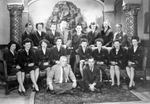 Description :PORTRAIT DE GROUPE A L'INTERIEUR DU CINEMA. PAR TERRE: JOHN MENTIS, LE RESTAURATEUR EST ASSIS, A GAUCHE; LUCIEN BEAUDOIN EST ASSIS · DROITE. DE GAUCHE A DROITE, ASSIS: MLLE ? LEFEBVRE;?; MLLE ? DESHARNAIS;?; JEANNE PATRY; MME ? NADEAU; ?; PAU...