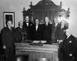 Description :AUTOUR DU BUREAU DU MAIRE, SEPT EX-MAIRES ENTOURENT A.TRUDEAU (LE NOUVEAU). NOM ET POSITION DE CHACUN A L'ARRIERE DE LA PHOTO.