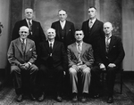 Description :AUTOUR DE CLAUDE GENEST, PRESIDENT DE LA CHAMBRE DE COMMERCE, ON APERCOIT LES ANCIENS MAIRES. DE GAUCHE A DROITE: JOSEPH LABRECQUE; MARCUS TRENHOLM ARMITAGE; ALEXANDER CLARK ROSS (A L'ARRIERE); CLAUDE GENEST; ALBERT CARLOS SKINNER; JAMES KEITH...