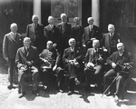 Description :PHOTO DE GROUPE REUNISSANT 12 EX-MAIRES DE LA VILLE DE SHERBROOKE A LA RESIDENCE DU MAIRE EMILE RIOUX (SUR LA RUE WILLIAMS). AU BAS, LES NOMS DES PERSONNES PRESENTES ET LA DATE OU ILS ETAIENT MAIRES.