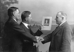 Description :3 EMPLOYE DU DEPARTEMENT DU GAZ ET DE L'ELECTRICITE DE LA VILLE DE SHERBROOKE SE SONT REUNIS POUR NOEL ET TIENNENT UNE PHOTO D'UN MILITAIRE QU'ON SUPPOSE ETRE J.K.EDWARDS. DE GAUCHE A DROITE: B.A.DUGAL, J.R.MCGREGOR ET J.NOEL.