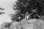 Description :JEAN-FRANCOIS ET ANNIE SONT ASSIS SUR UN ROCHER DEVANT UN ARBRE.