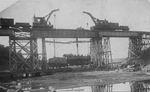 Description :SUITE A UN ACCIDENT FERROVIAIRE SURVENU EN NOVEMBRE 1907 A EASTMAN, 2 DEPANNEURS DU C.P.R., MUNIES DE GRUES MECANIQUES, SONT INSTALLEES SUR UN VIADUC FERROVIAIRE ET SOULEVENT LA LOCOMOTIVE A VAPEUR.