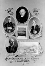 Description :MOSAIQUE A 6 ELEMENTS: (DANS LE SENS HORAIRE A PARTIR D'EN HAUT). - 1 : LE TRES REVEREND A. E. DUFRESNE V.G. - 2 : MGR. PAUL LAROCQUE, 2e EVEQUE. - 3 : SHERBROOKE EN 1834. - 4 : MGR. H. O. CHALIFOUX, EVEQUE AUXILIAIRE. - 5 : MGR. ANTOINE RACIN...