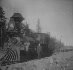 Description :UN HOMME SE TIENT DEBOUT A COTE D'UNE LOCOMOTIVE A VAPEUR NON IDENTIFIEE.