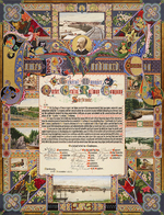 Description :DIVERS PAYSAGES ENCADRENT UNE ADRESSE A L'INTENTION DE JAMES R.WOODWARD QUI A OEUVRE POUR LA CONSTRUCTION DU CHEMIN DE FER DE SHERBROOKE A QUEBEC. SCENES DE LA RIVIERE ST-FRANCOIS, DU PONT DE QUEBEC, DU GRAND "TRESSEL" DE LEVIS, DE LOCOMOTIVES...