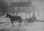 Description :EN HIVER, UN HOMME DANS SA CALECHE. A L'ARRIERE, ON VOIT L'EGLISE PROTESTANTE DE COMPTON.