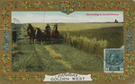 Description :EN SASKATCHEWAN, UN HOMME TRAVAILLE AU CHAMP AVEC SA MOISSONNEUSE-BATTEUSE TIREE PAR DES CHEVAUX.