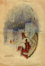 Description :DESSIN COULEUR DU CHATEAU DE GLACE A L'OCCASION DU CARNAVAL DE 1931. AU PREMIER PLAN, ON VOIT UN RAQUETTEUR AVEC LE COSTUME DE CIRCONSTANCE ET SES RAQUETTES ACCROCHEES A L'EPAULE.