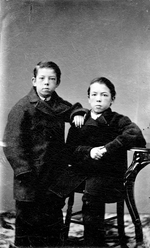 Description :DEUX JEUNES GARCONS COTE A COTE. CELUI DE GAUCHE EST DEBOUT ET L'AUTRE ASSIS. LES DEUX PORTENT UN MANTEAU.