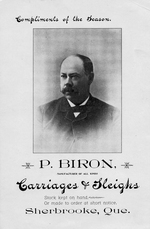 Notes :PAMPHILE BIRON FUT LE FONDATEUR DE P. BIRON & SONS EN 1857. NE EN 1838, DECEDE EN 1917.MEME PHOTO, FORMATS DIFFERENTS: IP447 PN 41A ET IP447 CA 41A. CETTE PUBLICITE EST AUSSI UNE CARTE DE SOUHAITS POUR LE TEMPS DES FETES.