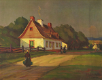 Description :UNE PARTIE DU PAYSAGE RURAL DE ST-JOACHIM: TROIS FEMMES PORTANT DES SEAUX, SUR LA ROUTE, PRES D'UNE MAISON CANADIENNE TYPIQUE.