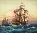 Description :2 NAVIRES BRITANNIQUES, DE GRANDS VOILIERS, SILLONNENT L'OCEAN PACIFIQUE AU LARGE DE VANCOUVER VERS 1778. ON DIT QU'IL S'AGIT DE L'EXPEDITION DU CAPITAINE COOK. UN DES NAVIRES PORTE LE NOM DE: "RESOLUTION".