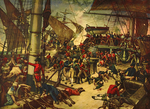 Description :SCENE DE BATAILLE SUR UN NAVIRE RAPPELANT LA MORT DE L'ADMIRAL NELSON A TRAFALGAR, AU LARGE DE L'ESPAGNE EN 1805.