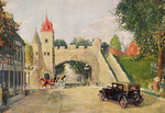 Description :UNE AUTOMOBILE DES ANNEES 1910 EMPRUNTE LA PORTE ST-LOUIS DE QUEBEC, SITUEE RUE GRANDE ALLEE (CHEMIN ST-LOUIS). QUELQUES PASSANTS ET UNE CALECHE COMPLETENT LE DECORS.