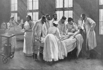 Description :UN ENFANT EST COUCHE SUR UN LIT D'HOPITAL. UN MEDECIN S'APPRETE A LA VACCINER SOUS LE REGARD DE PLUSIEURS AUTRES MEDECINS ET DE QUELQUES INFIRMIERES.