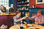 Description :DEUX HOMMES ASSIS A UNE TABLE LEVENT LEURS VERRES SOUS L'OEIL AMUSE DU BARMAN, DEBOUT DERRIERE SON COMPTOIR. CETTE SCENE A ETE REPRODUITE A UPPER CANADA VILLAGE EN ONTARIO.