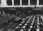 Description :LA CHAMBRE DES COMMUNES: LES DEPUTES SIEGENT DE CHAQUE COTE DE LA CHAMBRE DANS CE QUI SEMBLE UNE CEREMONIE OFFICIELLE. DES SPECTATEURS OBSERVENT DU HAUT DE L'ESTRADE.