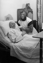 Description :M.OMER CHAPUT COUCHE DANS SON LIT. PRES DE LUI, ON VOIT SA GARDE-MALADE, SOEUR STE-AIMEE DES SOEURS DE LA CHARITE DE QUEBEC. M.CHAPUT A UN CHAPELET AUTOUR DU BRAS.