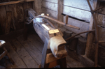 Description :CHARRUE A NEIGE EN BOIS ENTREPOSEE DANS UN ETABLE.
