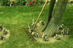 Description :VUE SUR UN RATEAU A FOIN EN BOIS APPOSE CONTRE UN ARBRE.