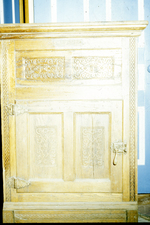 Description :FACADE SCULPTEE D'UNE ARMOIRE EN PIN. FABRICATION ARTISANALE.