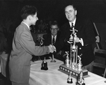 Description :LORS D'UNE REMISE DE PRIX AU CENTRAL SCHOOL, LAURENT BIRON, JEUNE HOMME, RECOIT UN TROPHEE DE QUILLES DES MAINS DU DEPUTE MAURICE GINGUES.
