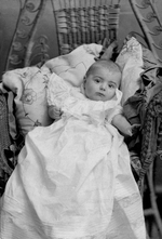 Description :PHOTO STUDIO DE SIMONE BIRON VERS L'AGE DE 6 MOIS, DANS UNE ROBE LONGUE (GENRE BAPTEME) ET COUCHEE SUR UN FAUTEUIL EN ROTIN.