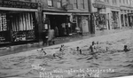 Description :VUE SUR LA RUE WELLINGTON NORD. ON VOIT DE L'EAU DANS LA RUE ET DES ENFANTS QUI SE BAIGNENT. QUELQUES COMMERCES SONT IDENTIFIABLES: WOOLWORTH CO., LA PHARMACIE CHAGNON ET LE STUDIO SEARS.