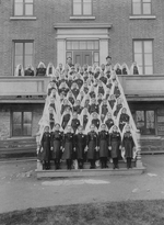 Description :GROUPE DE FILLETTES A L'EXTERIEUR DE LA CATHEDRALE, PORTANT LE VOILE DE PREMIERE COMMUNION. ON PEUT RECONNAITRE SUR LA PHOTO L'ABBE C.J.ROY, PREMIER VICAIRE A LA CATHEDRALE (A DROITE) ET L'ABBE J.A.H. GIGNAC, CURE.