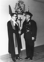 Description :VUE DU JUGE CHARLES QUIMPER SERRANT LA MAIN DU POLICIER ALBERT BELL DEVANT LES ARMOIRIES DE LA VILLE, LES DRAPEAUX ET LE CRUCIFIX.
