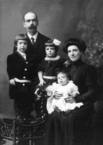 Description :PHOTO DE STUDIO DE LA FAMILLE DE FREDERIC-ANTOINE BIRON (DEBOUT), LEON (SUR UN TABOURET), SIMONE, ALMA THERIEN BIRON ASSISE AVEC GERTRUDE SUR SES GENOUX, ALMA PORTE UNE COIFFURE RELEVEE ET LA ROBE LONGUE ET SOMBRE D'EPOQUE.