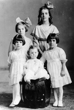 Description :GROUPE D'ENFANTS (FILLES) DE FREDERIC-ANTOINE BIRON. 1ER RANG: ISABELLE, THERESE (ASSISE SUR UN TABOURET) ET FERNANDE. 2e RANG: GERTRUDE, SIMONE (ELLE PORTENT D'ENORMES BOUCLES A LEUR COIFFURE). ISABELLE ET FERNANDE ONT L'AIR DE JUMELLES.