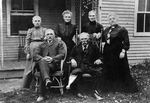 Description :GROUPE DE PERSONNES AGEES. DEBOUT ET ASSISES SUR UN PARTERRE DEVANT UNE MAISON. 1ERE RANGEE, ASSIS: TOUSSAINT THERRIEN, JULIEN THERRIEN (IL A UNE "JAMBE DE BOIS" A LA JAMBE DROITE). 2e RANGEE: OLIVINE RYAN, VALERY FLEURY, JOSEPHINE MASSON, HER...