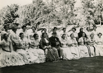 Description :LE DOMAINE, UN GROUPE DE JEUNES FILLES POSE EN COMPAGNIE DE CHARLES BENJAMIN HOWARD ET DE SON EPOUSE A L'OCCASION D'UN GARDEN PARTY LORS DU CENTENAIRE DE SHERBROOKE. TOUTES SONT EN COSTUME D'EPOQUE. LA QUATRIEME DE GAUCHE, DEBOUT EN ARRIERE, E...