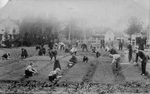 Description :VUE SUR UN GROUPE DE JEUNES GARCONS (25 ENV.) QUI SOUS LA SURVEILLANCE DE DEUX FRERES DU SACRE-COEUR TRAVAILLENT A L'ENTRETIEN D'UN JARDIN